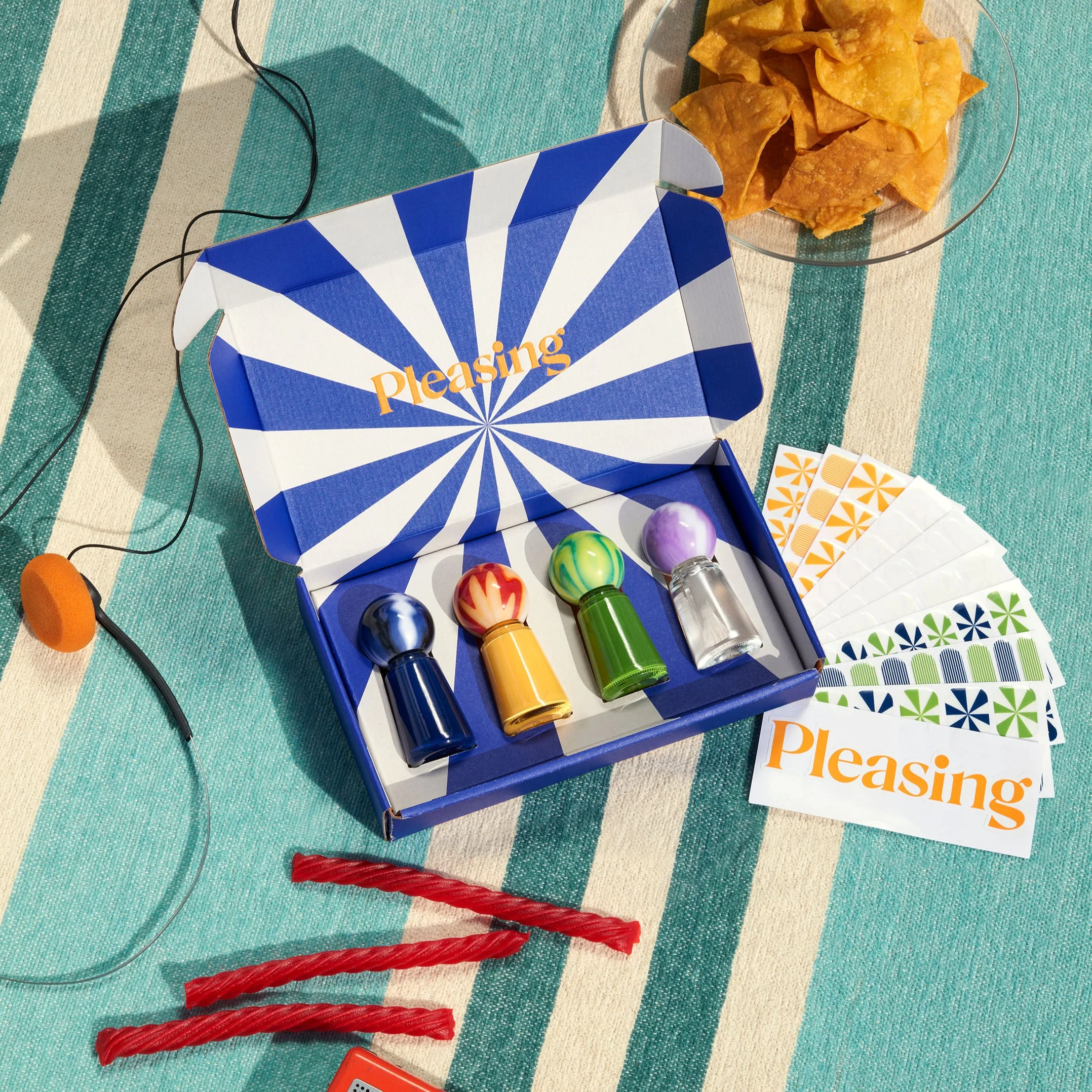 Beach Ball is a deep blue opaque gloss formula that acts as a reminder of the riches that lie under the sea beyond the waves. Nonna’s Sorbet is a vibrant yellow opaque gloss formula that's as delicious as it is nostalgic to act as sunshine bottled. Harry’s Chair is an earthy green opaque gloss formula that brings a retro feel, like the simple pursuit of playing with a bucket and spade or licking a stamp for a postcard sent home. Wet Bottoms is a wet-look clear topper formula to bring a high shine to your chosen color pairings, emulating the strong beams of a midday sun.